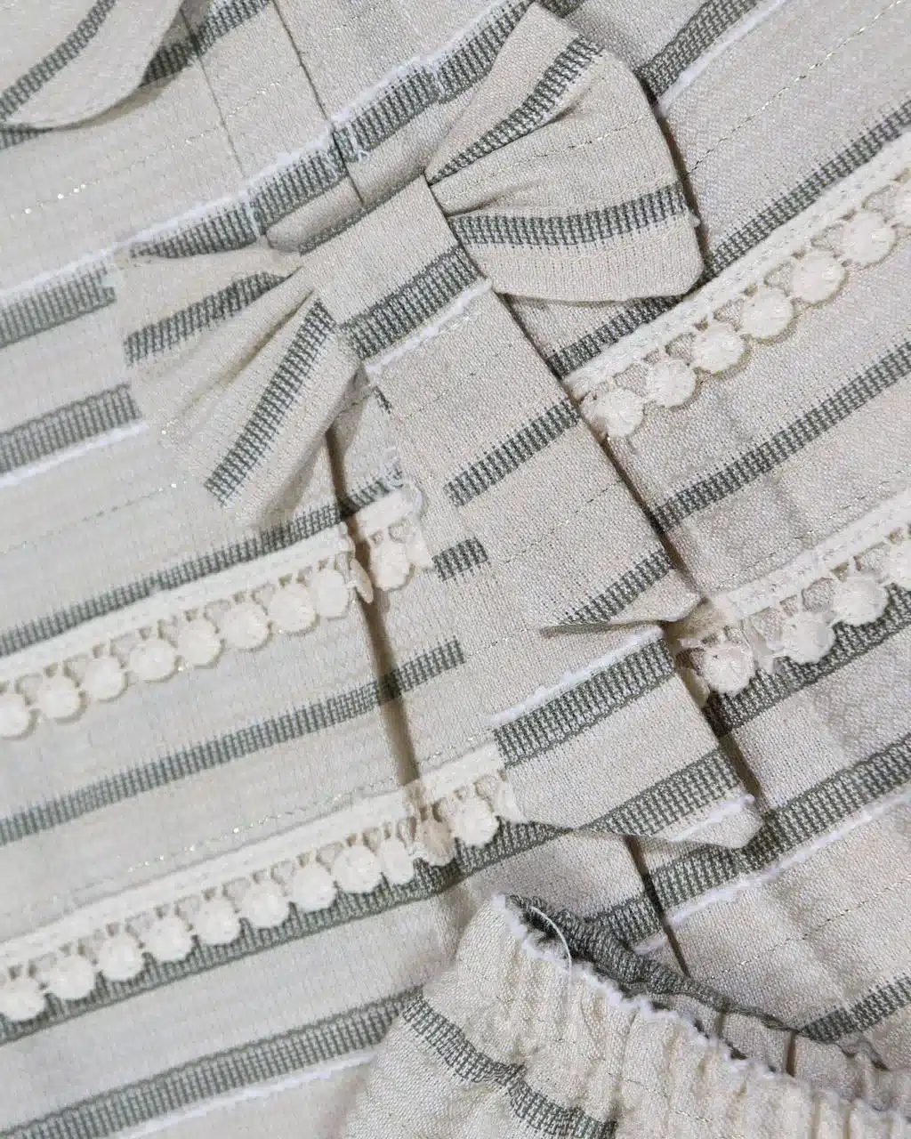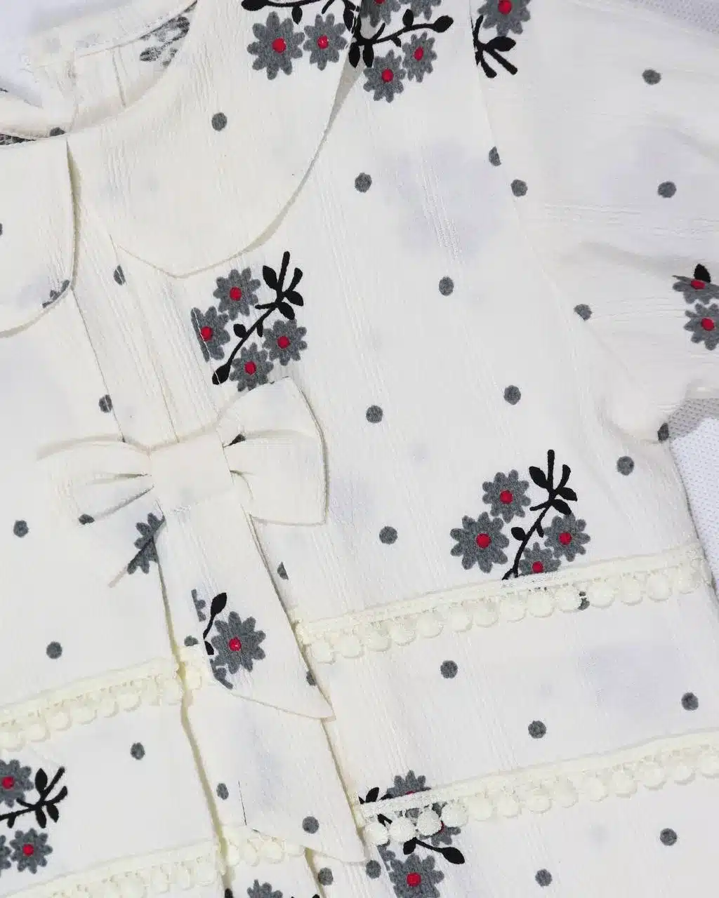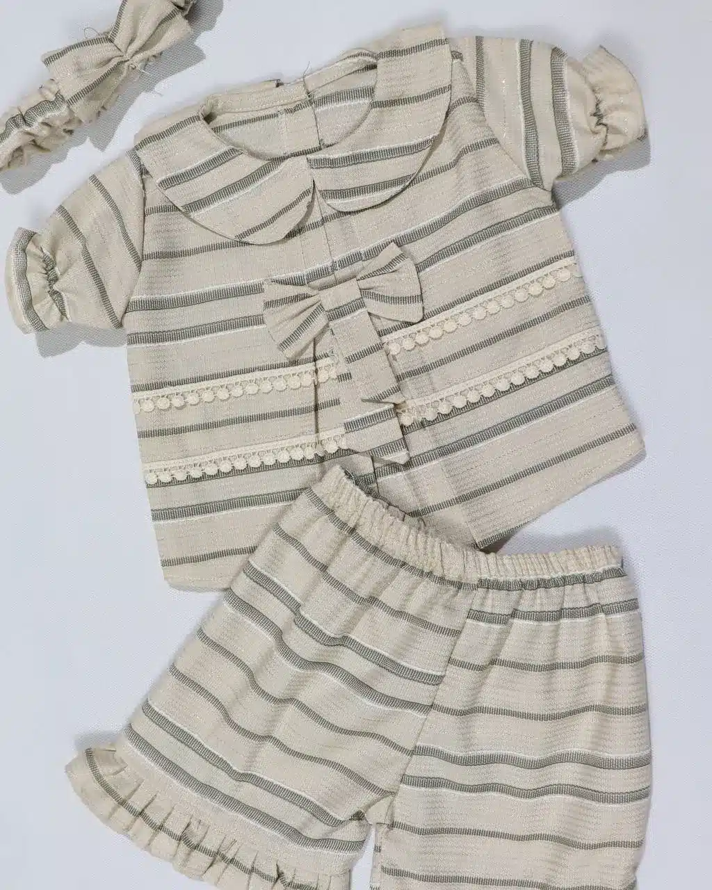 هر دو قطعه این ست از پارچه لنین (معمولاً ویسکوز یا ریون) تولید شدهاند که بافت نرم، براق و خنکی دارند. این پارچه سبک است و چین مناسبی میخورد. طرحها به روش چاپ روی پارچه نقش بستهاند. کمر شلوارک کشی و تزئیناتی مانند پاپیون دارد. آستین تیشرت کوتاه یا اصطلاحاً حلقهای است.