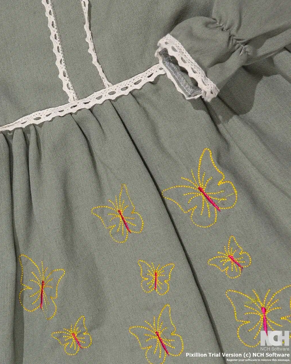 جنس این سارافون دخترانه لنین نواردار از پارچه لنین است که معمولاً از جنس ریون یا ویسکوز میباشد. این پارچه دارای بافت نرم است و چینهای زیبایی ایجاد میکند. نوارهای تزئینی نیز از جنس گیپور روی آن دوخته شدهاند.