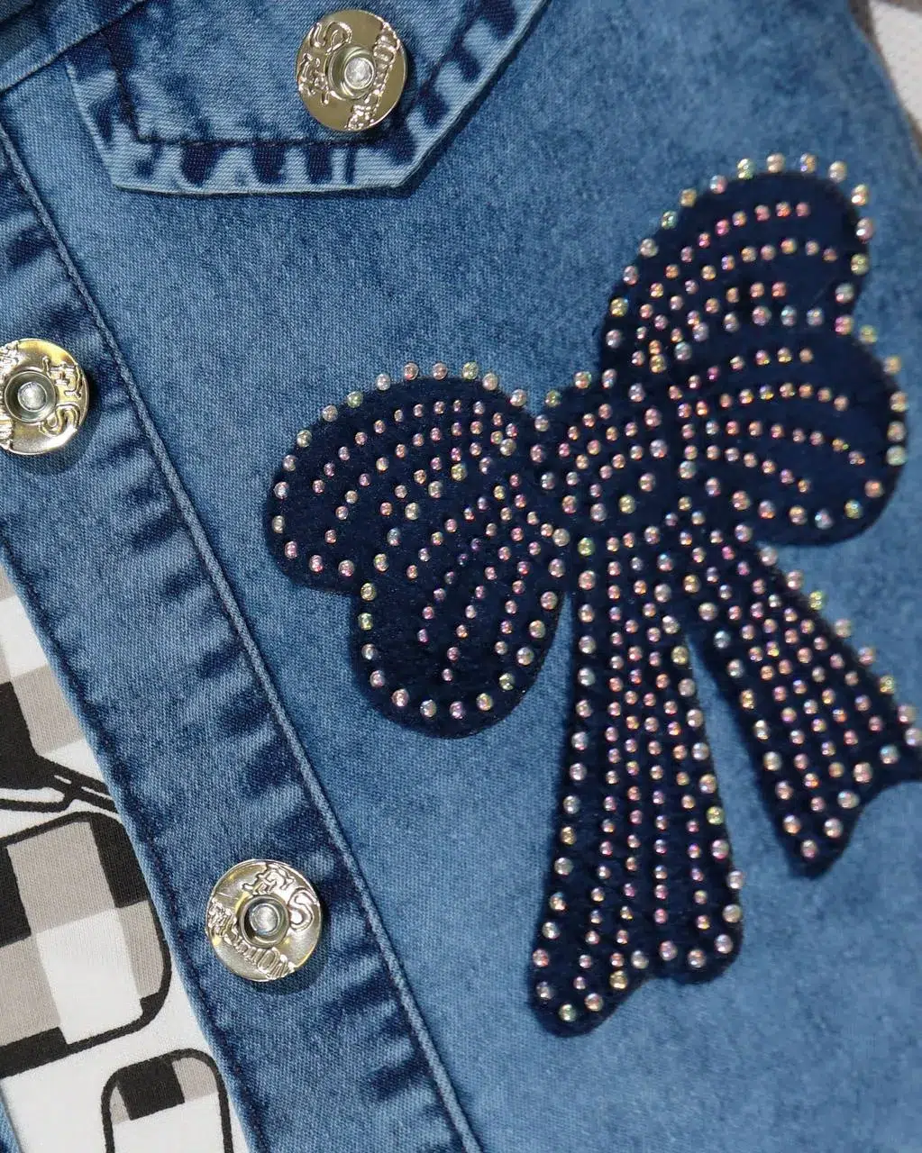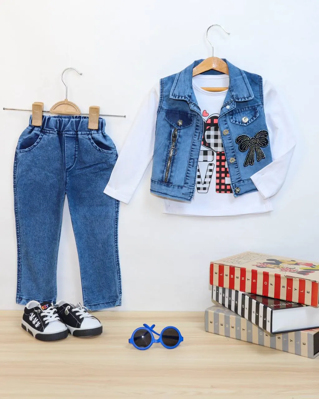 این سه تیکه دخترانه لی پاپیونی یک ست شیک و دخترانه برای مناسبتهای خاص است. این ست معمولاً شامل یک بلوز، یک جلیقه و یک شلوار میشود. جنس لی با دوام و محکم خود، ظاهری مرتب و تمیز ایجاد میکند. زیبایی اصلی این ست در پاپیونی است که روی جلیقه به عنوان تزئین جداگانه وجود دارد و حس ظرافت و بانمکی به لباس میبخشد.