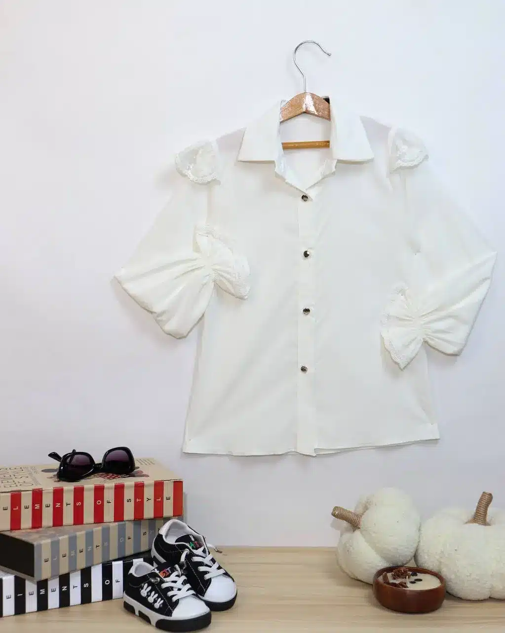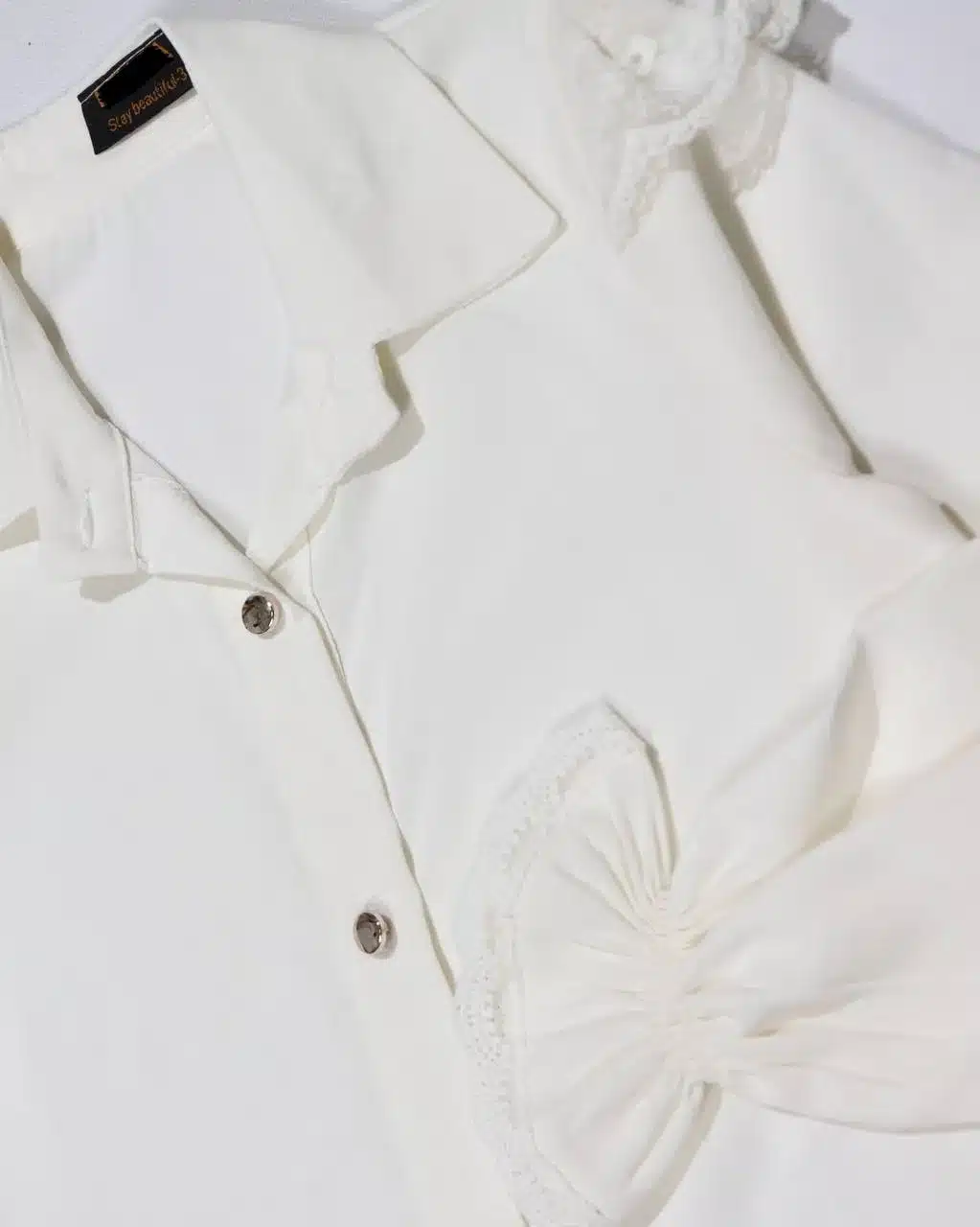 تزئینات گیپور که در سرشانه، سرآستین‌ها دوخته شده، زیبایی و ظرافت خاصی به این شومیز تک دخترانه گیپور می‌بخشد. برش معمولاً کلاسیک و کمی گشاد است که اجازه حرکت راحت را می‌دهد و می‌توان آن را روی شلوار جین، شلوارک یا دامن ساده پوشید تا استایلی شیک و مناسب مناسبت‌های خاص ایجاد شود.